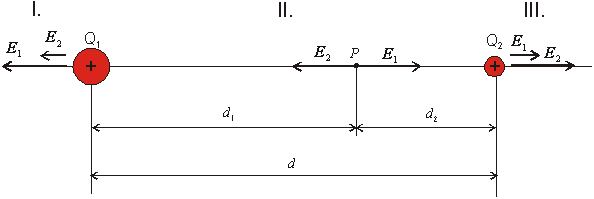 Podľa obrázka je zrejmé, že výsledná intenzita môže byť nulová iba v oblasti II. Výsledná intenzita elektrického poľa v bode P sa rovná súčtu intenzít E1 a E2, ktorými prispievajú jednotlivé náboje. Intenzita sa rovná nule, keď E1 + E2 =0. Podľa obrázka je to vtedy, keď E1 = E2, teda