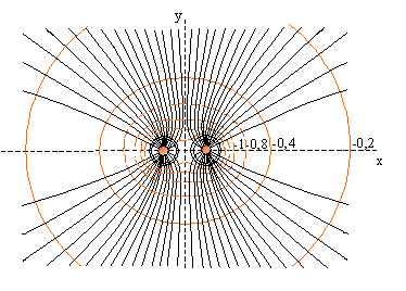 zakreslené plnými čiernymi čiarami, ekvipotenciálne hladiny farebnými čiarami.